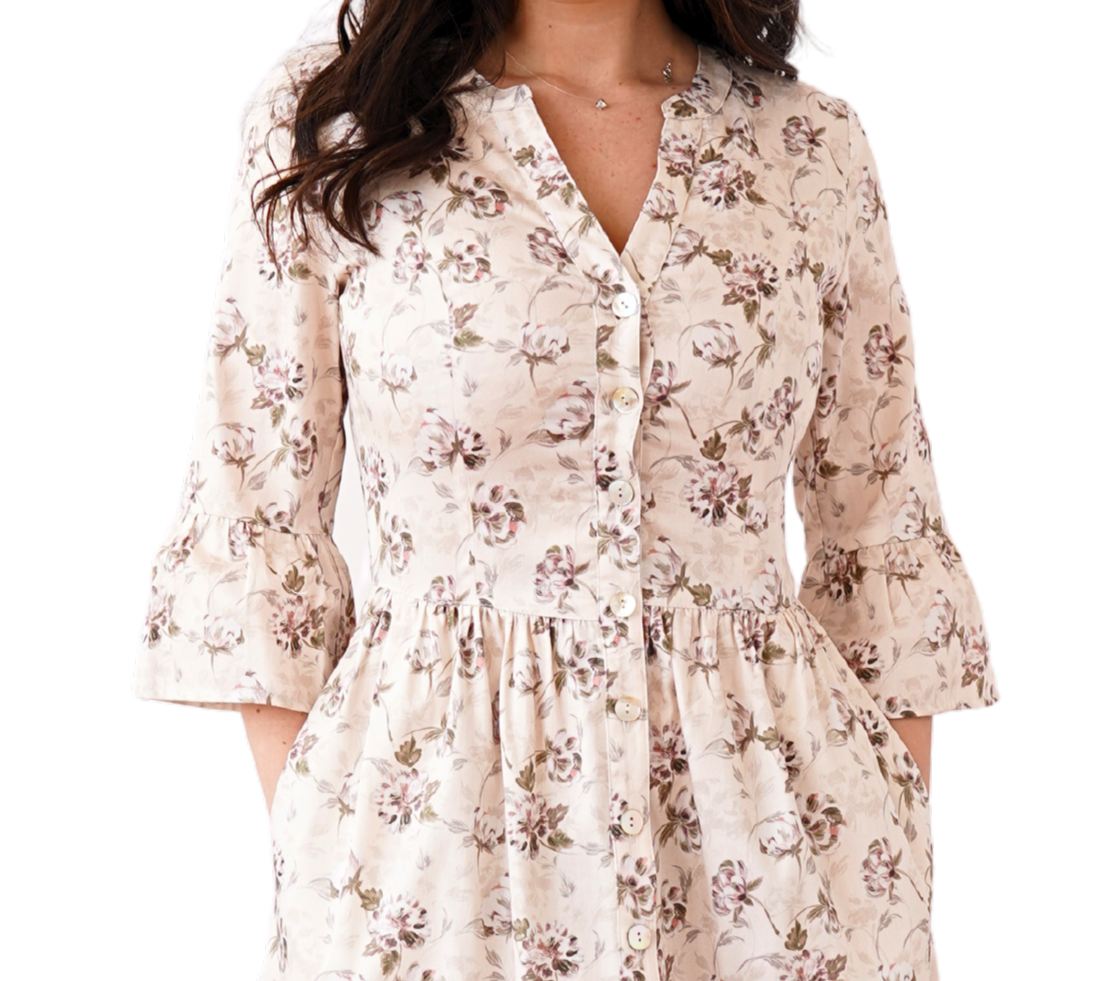 Descoperă frumusețea naturală a acestei rochii din bumbac 100%, cu un imprimeu floral discret în nuanțe de crem și maro. Perfectă pentru zilele însorite, această rochie îmbină eleganța simplă cu un confort excepțional, fiind ideală pentru plimbări, birou sau întâlniri casual.