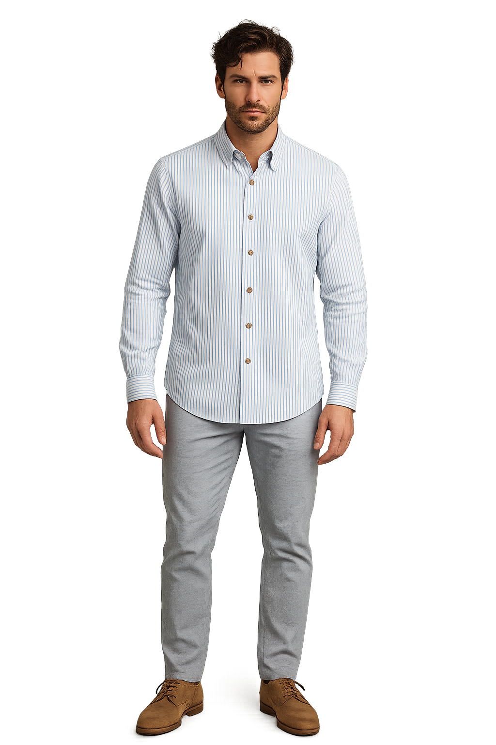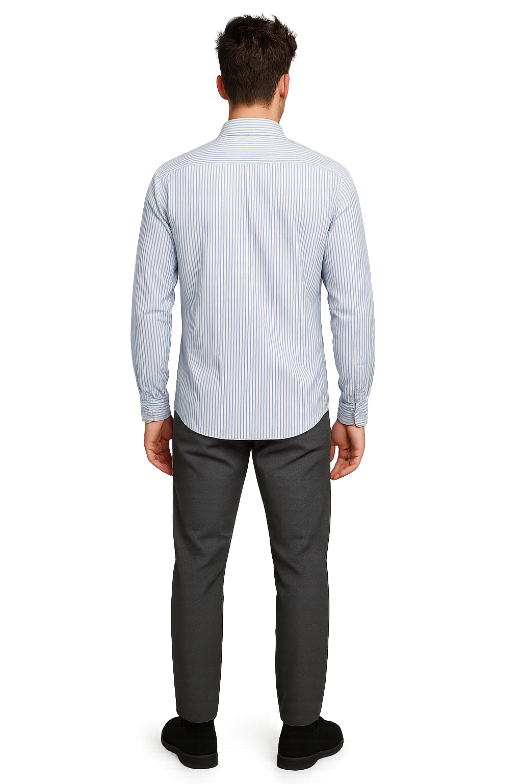 Modelul în dungi fine alb–albastru deschis transmite un look fresh, impecabil și modern, ideal pentru zilele de birou, întâlniri importante sau ținute smart casual. Nasturii naturali din nucă de cocos (corozo) sunt detaliul premium care diferențiază această cămașă de produsele obișnuite — durabili, naturali, folosiți în mod tradițional de brandurile high-end.