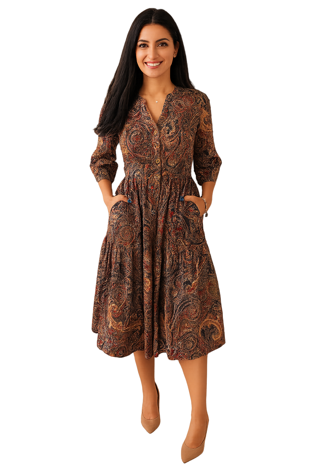 Această rochie cu imprimeu paisley în nuanțe pământii te va cuceri prin stilul său boho-chic. Croiala lejeră și materialul din bumbac moale o transformă într-o piesă esențială pentru zilele relaxate sau ieșirile speciale.
