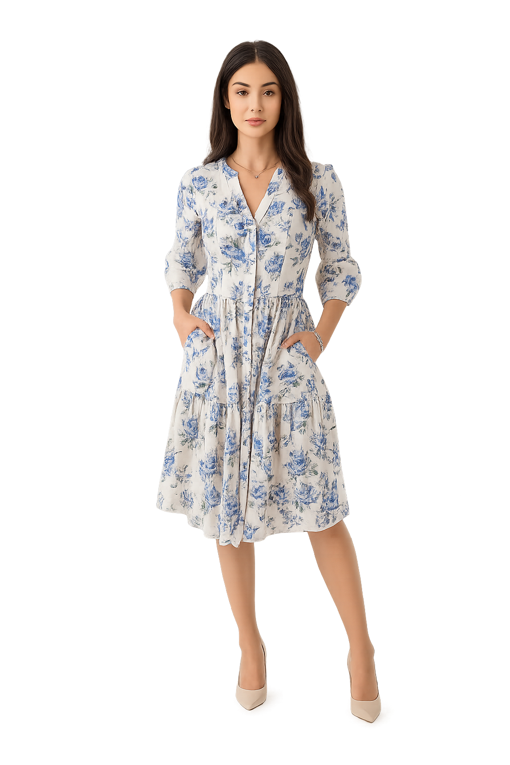 Alege o rochie realizată din bumbac 100% pentru un confort absolut și un aspect delicat. Imprimeul floral albastru intens conferă un aer sofisticat și feminin, ideal pentru zilele însorite sau serile relaxante în oraș. O piesă vestimentară versatilă, care îți oferă atât lejeritate, cât și stil.