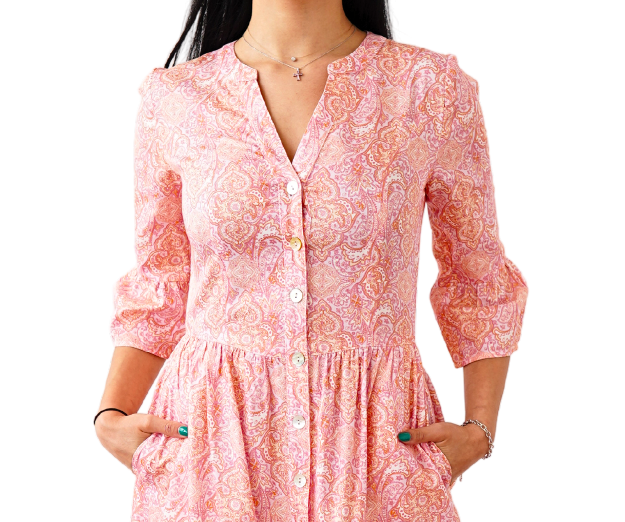 Această rochie din bumbac 100% îți oferă confort și eleganță într-un singur produs. Cu un imprimeu floral delicat în nuanțe de roz și alb, croiala lejeră și designul cu nasturi frontali, este ideală pentru zilele călduroase, plimbări în natură sau ieșiri speciale.
